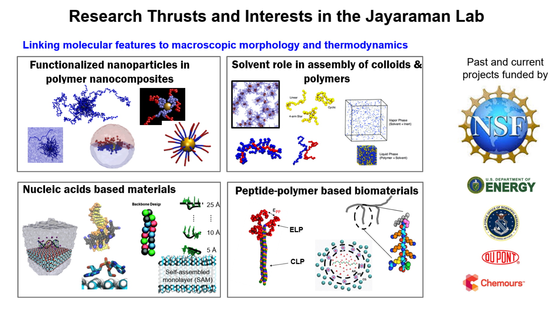Prof. Jayaraman's research expertise lies in development of theory and simulation techniques and application of these techniques to study polymer functionalized nanoparticles and polymer nanocomposites, and to design macromolecular materials for biomedical applications.