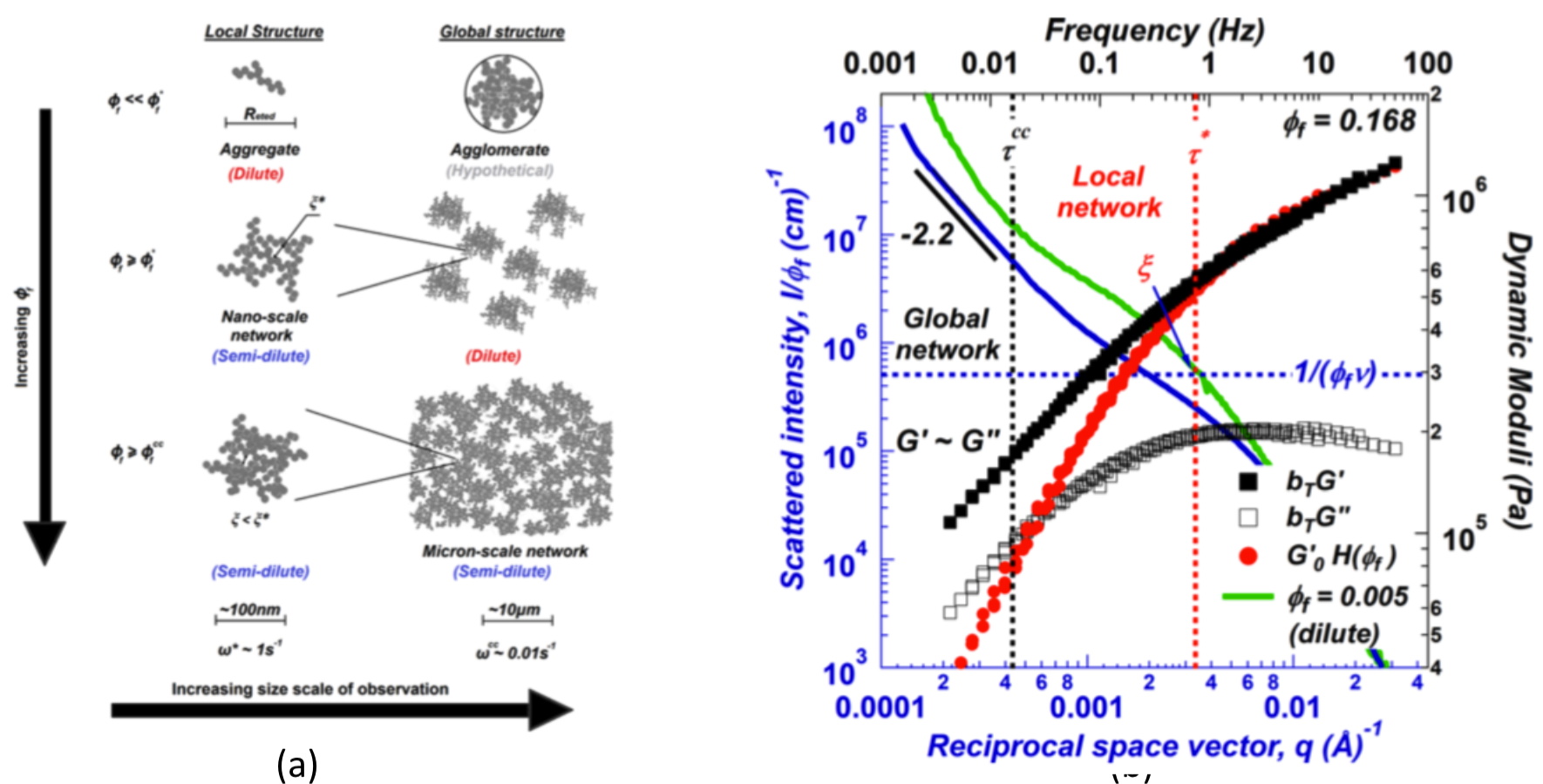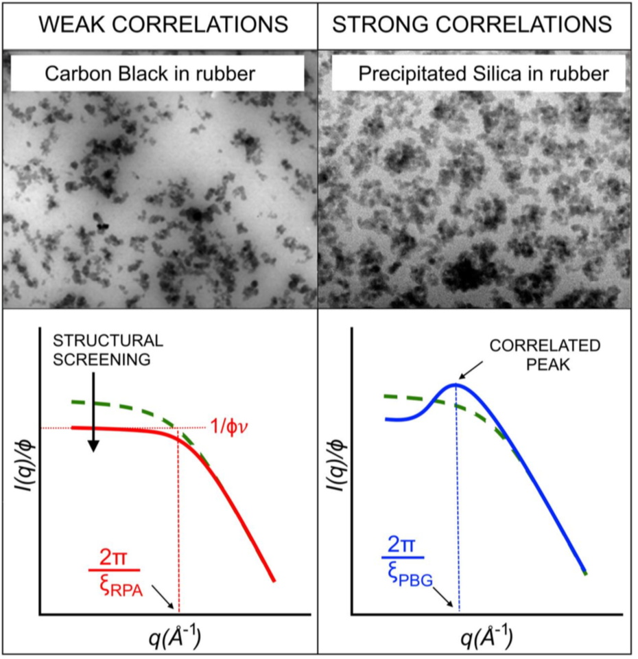 Materials such as paints, inks, filled polymers, and reinforced elastomers involve immiscible, generally aggregated, polydisperse particles which are often on the nanoscale which assemble through processing, application, and time into useful structures often reflecting a network such as a filler network or pigment network on the micron to macro-scale.