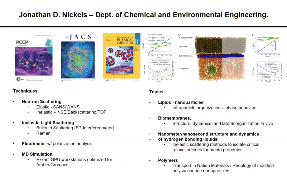 Jon Nickels is interested in elastic and inelastic scattering and MD simulations. He ahs worked in biomaterials, nanoparticles and polymers.