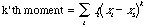 where fi is the fraction of all measurements which have the value xi, i.e. Ni/N, xs is basis for the moment and k is the order of the moment. For example, the mean, u, is the first moment (k = 1) about the origin (xs = 0). The variance, [sigma]2, is the second moment (k = 2) about the mean (xs = u).