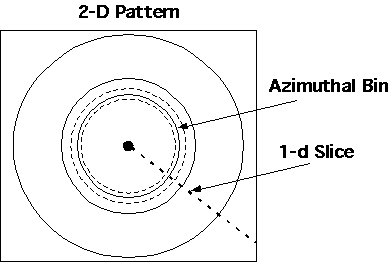 q generating an intensity versus 2q plot (Bold Dashed Line Below). Such a 1-d step scan might take 2 to 3 hours. If the diffraction pattern is isotropic, the same accuracy can be achieved in minutes using a 2-d detector. The 2-d pattern in this case is averaged about the beam center by binning the data into rings as shown below.