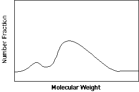 The distribution shown above is bimodal (two identifiable peaks) and skewed (neither of the peaks is a symmetric about their means and the entire bimodal distribution is not symmetric about the mean. Such a distribution of molecular weights can be described by statistics in terms of moments. (see: =>Statistical Descriptions)