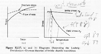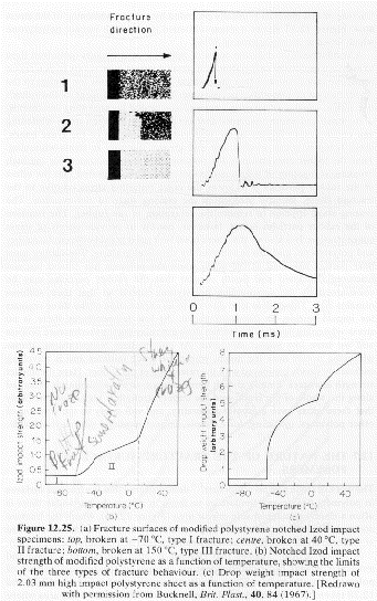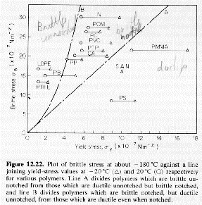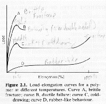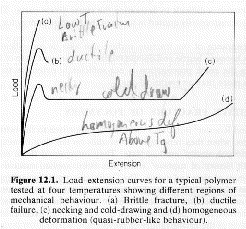 The following figure from Ward shows that all three of these failure types can be seen in a single polymer by variation of either time (rate of deformation) or temperature. A good example of this is silly putty. Generally, a single polymer sample displays one of the characteristic failure mechanisms under normal conditions, i.e. polystyrene exhibits brittle failure, polyethylene displays necking, crosslinked polydimethylsiloxane displays rubbery behavior, high impact polystyrene displays yielding behavior. The type of behavior can also change with the type of deformation, i.e. polystyrene displays crazing or brittle failure in tension but displays shear banding and yield behavior in compression.