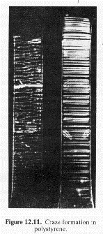 Many polymers display another type of localized yielding behavior which results in whitening of the polymer in the region of maximum deformation. Under a microscope, these localized regions of yielding display an increase in volume (dilatation) through formation of micro-cracks which are bridged by polymer fibrils. Crazing and stress whitening are the typical deformation mechanism for polystyrene. High impact polystyrene contains small elastomer domains which serve to increase the number of crazes thereby preventing catastrophic failure by absorbing the energy of deformation. Because crazing is a dilatational mechanism it is expected to occur in regions of high dilatational stress such as in the interior of thick samples or at the lateral edges of a hole cut in a sample (see figure below).