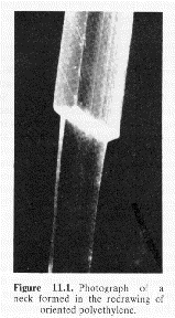 Semi-crystalline polymers such as polyethylene typically display necking behavior and a yield point in tensile stress/strain curves. Yield points are always associated with a deformation mechanism which absorbs energy. For semi-crystalline polymers this mechanism involves orientation and destruction of micron to colloidal scale semi-crystalline morphologies.