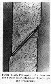 Many polymers display shear banding which is characterized by planes of slip at 45° to the direction of stress. Shear bands do not involve changes in the volume of the sample (dilatation) seen in crazing. Under an optical microscope using crossed polars samples which have under gone shear banding will display X's reflecting the two planes of maximum shear stress in a tensile sample. Shear banding involves localized orientation of the polymer. Because of this it is highly temperature and rate dependent.
