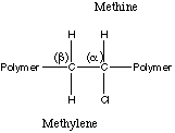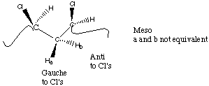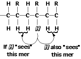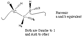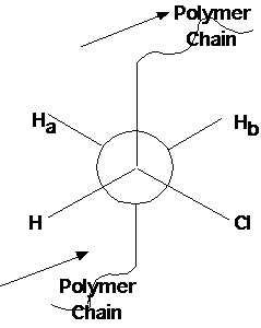 The presence of the Cl substitutent group allows for the distinction of Ha and Hb. Ha is anti to Cl and Hb is gauche to the Cl group. For each mer unit in this polyvinylchloride molecule there will be an anti and a gauche methylene proton. The relationship between these mer unit stereo chemistries gives rise to tacticity. Because of this the smallest grouping for tacticity is a diad, two mer units.