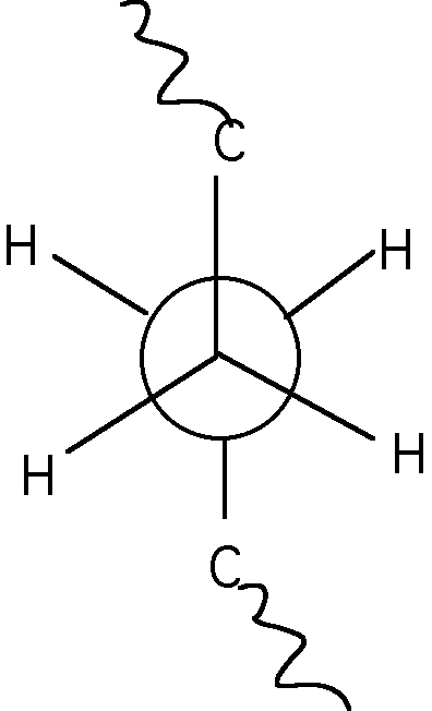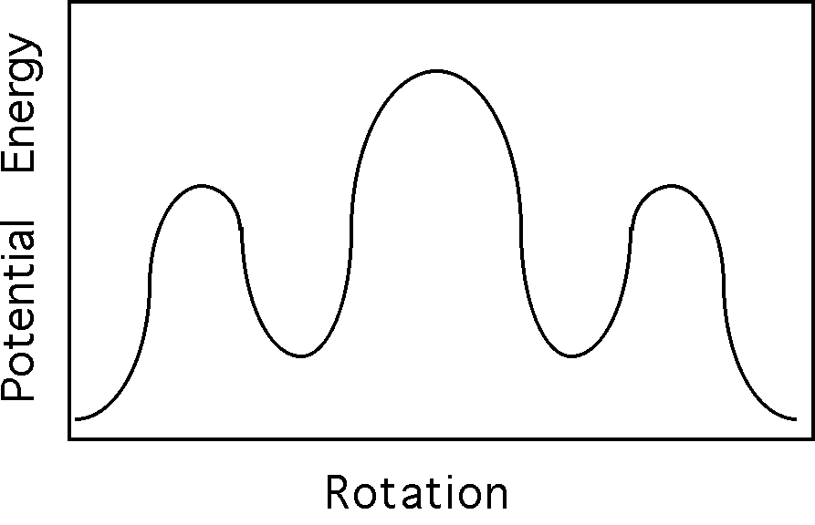 Note that the handedness, anti or gauche, is independent of rotation about the C-C bonds which occurs in all single bond chains. The particular arrangement shown above is merely for convenience of comparison between meso and racemic diads and does not reflect the actual conformation of the chains in a polymer which would be reflected by a distribution of rotational orientations reflecting the potential energy diagram for C-C bond rotation as show below for polyethylene (PE does not display tacticity),