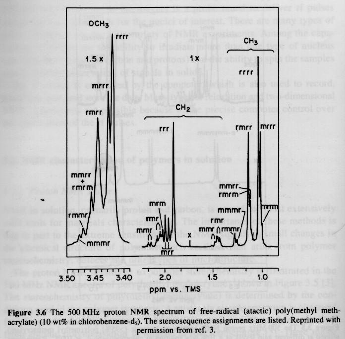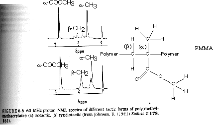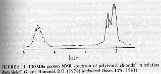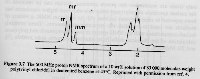 A similar comparison of signal can be made for the 100 and 500 MHz spectra of polyvinyl chloride given below. [beta]-methylene protons occur at 1.5-2.5 range and the single a-methine proton is observed at about 4.6. In many polymers resolution of splittings for individual stereochemical peaks is not possible and this is illustrated by the PVC spectra. In such cases the tactic sequences can be identified with complicated NMR techniques such as 2-D NMR (see Campbell and White). Generally you will find a reference which has identified the peaks associated with certain tactic groupings for vinyl polymers and use the integrated areas of these peaks to determine the triad tacticity of a given polymer. (Note that the PMMA example given above is the best resolved spectra of commodity polymers, i.e. sharpest peaks, and this is related to the structure of PMMA).