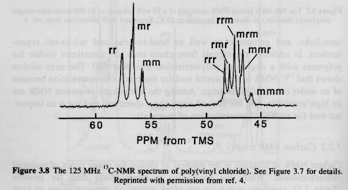 The splittings of the tactic peaks in the proton NMR spectrum of PVC, shown above, are not resolvable on typical NMR spectrometers. Use of a different nucleus, 13C, can overcome problems with resolution of this type. The 125 MHz, 13C spectra for PVC is shown below. Notice the higher resolution even compared to the 500 MHz proton spectra shown above. (Note that spectrometer magnetic field strength is in reference to the proton resonance frequency even if a different nuclei is probed.)