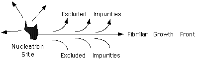 (Incidentally, the growth of dendrites can occur due to similar impurity transport issues as the growth of fibrillar habits in polymers. In some cases a similar mechanism has been proposed where rather than impurity diffusion, the asymmetric growth is caused by thermal transport as heat is built up following the arrows in the diagram on the previous page.)
