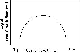 DT = T° - Tc). At low undercoolings the growth rate is slow since the thermodynamic driving force for crystallization is low. As the quench depth is increased the growth rate increases, reaches a maximum at about 50° below T° and then monotonically decays with quench depth. This type behavior is shown in figure 4.16 pp. 162 and is characteristic of many materials. Similar curves can be obtained by careful thermal analysis.u (T) = k (Transport (T)) (Growth driving force (T))