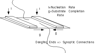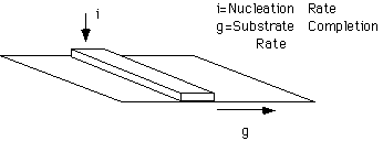 The figure below shows a schematic of the two competing factors which govern the linear rate of crystallization for a polymer lamellar crystal. The direction of crystal growth is up. The rate of this linear growth, u, is governed by the rate of nucleation (secondary nucleation) on the lateral surface of the growing lamellae, i, and the rate of completion of the substrate layer, g.