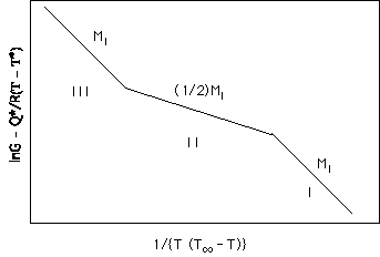 Plots of the log of growth rate minus the transport constant (which can be independently determined) versus 1/T(T° -T) will yield the growth constant Kg. For Regime I, Kg is proportional to ln(i), for Regime II, to 1/2 ln(i) and for Regime III, to ln(i) since g is proportional to i in all cases. The slope of this reduced growth rate curve will be the same in Regime I and Regime III but will be 1/2 of the Regime I slope in Regime II. The prefactor is different for the three regimes,