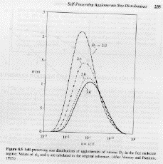 Aggregate self-preserving distributions solved using a discrete sectional model are shown in the figure above (Vemury and Pratsinis). The time to reach the self preserving size distribution was also calculated by Vemury and Pratsinis and is shown in the figure below. In both cases the self-preserving limit is reached faster than spherical clusters.