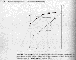 As growth proceeds, the presence of branches and the convoluted shape of the growing aggregate, reminiscent of the Brownian path of the colliding particles, shields the interior bonding sites from further growth. For this reason three-dimensional growth is not possible, except by internal rearrangement. Then we can consider that an asymptotic mass fractal dimension is approached in time that is a function of the persistence of the colliding particle velocity, lpa, and the degree to which monomers dominate over cluster transport. The latter issue is related to the diffusion coefficient in the media and thus, the Knudsen number. In all simulations of mass-fractal aggregation an asymptotic dimension has been observed at long times. This means that the overall density of the aggregate, N/R3 ≈ N(1-3/df) diminishes with time in the asymptotic range since N is a monotonically increasing function of time.