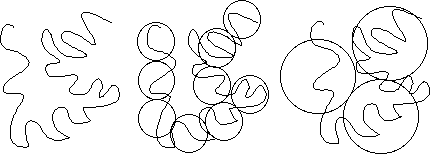 As the concentration of a polymer solution is increased it is possible to obtain conditions where there is a change in coil scaling with size of observation (size of the circles in the diagram above). If the circle size in the above diagram is set to the size scale of this transition, the subunit of the chain is called a blob. Through the use of renormalization and blobs much of the complicated scaling features observed in high polymers can be simplified into universal laws. This will be discussed in detail in Chapter 2.