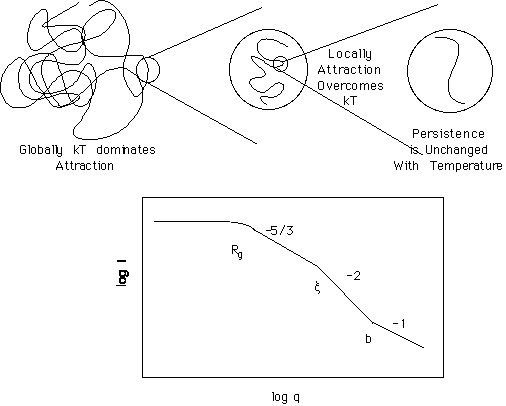 According to the "Blob" approach, the coil at an intermediate state of contraction between fully expanded and theta can be described as a polymer of nblob blobs which displays 5/3 dimension. Within the blob the thermal repulsion of segments have been overcome by the net attraction between segments leading to a Gaussian state with a coil dimension of 2. As the temperature is dropped the transition between Gaussian (at small sizes) and good solvent (at large sizes) shifts to larger and larger sizes (smaller q) until the entire coil is in the theta state at the theta temperature. The size of transition between good-solvent scaling and Gaussian scaling is called the correlation length or the "Blob" size. The persistence length remains unchanged while the overall coil size, as reflected in Rg, decreases as larger and larger range of size reaches the higher dimension (more compact).