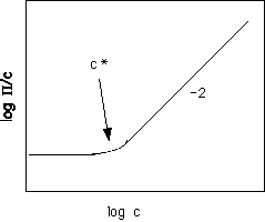 f << 1/{N(1/2 - c)}, so for very low concentrations for high molecular weight, N. For large N the first term drops out and P Å (kT/Vc) (1/2 - c) f2, which is independent of molecular weight and follows a power 2 in volume fraction polymer. The schematic below shows the expected behavior of log (P/C) in log C, (see Doi figure 2.2 pp. 25),