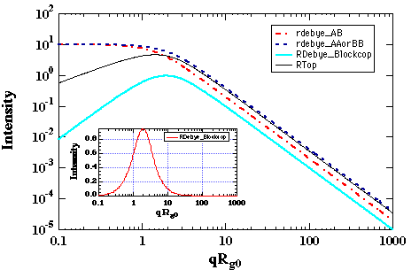 f, is the dilution of chains A in the block copolymer, SD is the Debye scattering function for a polymer coil and Ri is the coil's Gaussian radius of gyration. The Debye function is the Fourier-transform of the pair distribution function g(r) for the pairs of type AA or BB.To calculate