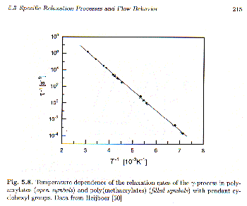 t0. The relaxation time can be obtained from the frequency of the maximum in the curves in figure 5, t = 1/wmax. Taking the log of the above equation for the Arrhenius relaxation time we have, log(t) = log(K) + (Ea/k) (1/T). So a log-linear plot of t (or w) versus 1/T should yield a line whose intercept is log(K) and whose slope is (Ea/k). Such a plot is shown in Strobls figure 5.8, from which Ea = 47 kJ/mole.