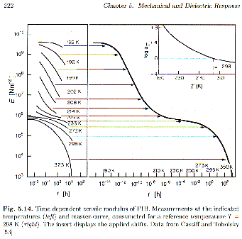 Strobls figure 5.14 shows a similar plot for the tensile modulus of polyisobutylene. The same regimes discussed for the creep compliance curve, above, exist in this curve.