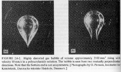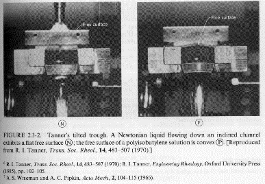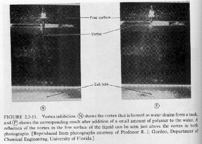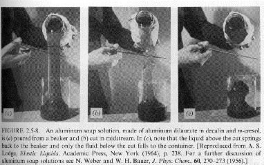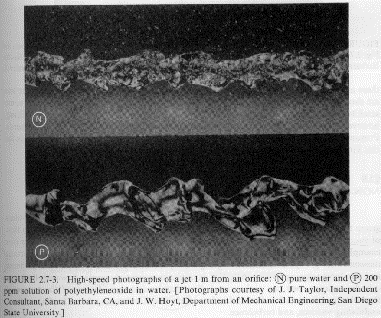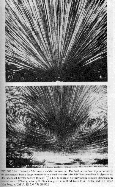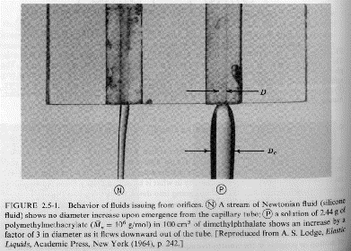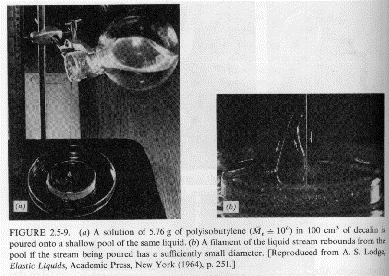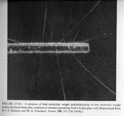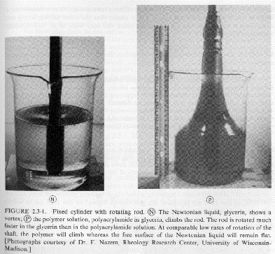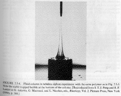 in the viscosity with shear rate (usually shear thinning behavior, see Chapter 1) and related issues of normal forces (Wiessenberg Effect and die swell). These issues are also related to the appearance of solid-like features (elastic component) to polymeric fluids including self-siphoning behavior, bubble shape, flow stabilization, fibrillation (ability to form fibers) and fluid memory effects. Several examples mostly from Bird Armstrong Hassager are given below. Most of these examples can be duplicated with common "structured" fluids such as molasses, shampoo or motor oil.