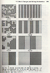 Tadmor Figure 7.1 pp. 199 (above), shows what is meant by distributive mixing for a random (particulate dispersion) and ordered (laminar flow of fluid elements). In both cases the two components are "mixed" but the resulting mixtures are distinguishable. The scale of segregation in a mixture is one measure of how "good" the mixing operation is. The intensity of segregation is another. Tadmor Figure 7.7 on pp. 209 (above) demonstrates the meaning of these two measures of "goodness of mixing". Since mixing is a statistical operation, one naturally uses statistics to describe mixing. This leads directly to functions which describe the correlation of phases in a mixture (Tadmor section 7.5 pp. 211 and Middleman Chapter 12).