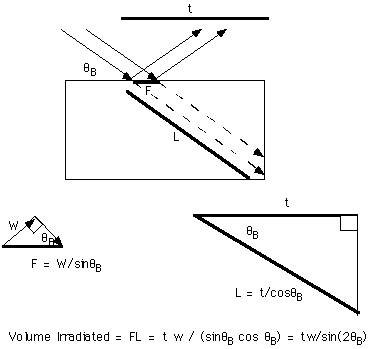 For a Diffractometer sample, a flat plate sample which rotates with the detector, the x-ray path length is independent of angle. This can be shown by a calculation using the sample shown below and the incident angle, exiting angle, Bragg angle and beam diameter as variables. The calculation parallels that for the Lorentz Factor above except that the square below is a polycrystalline sample and the square above is a single crystal that might be within the polycrystalline sample below. Also, the sample below is rotated with the detector so that the incident and diffracted beams have the same angle, a = b. The two incident arrows indicate the extent of the incident beam and the foot print, F, on the polycrystalline sample equals the beam width, W, between these arrows divided by sina, F = W/sina, as shown above for the Lorentz factor. For shallow angles the foot print is big, for sharp angles the foot print is small.