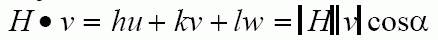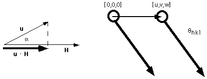 The real space location of an atom is given by the vector v = u a1 + va2 + wa3, and a set of planes in inverse space is defined by the vector H = hb1 + kb2 + lb3. The dot product of these two vectors corresponds to the projection of v in the direction H,