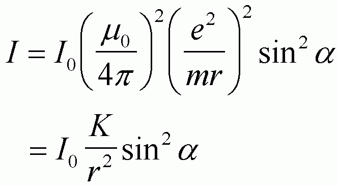 We have previously discussed the 1/r2 dependence of scattering. This results from any isotropic (same in all directions) radiation that is sampled using a fixed size detector since the amount of radiation per area decreases with the increasing area of a sphere surrounding the source. The angle a is the angle between the direction of acceleration of the electron (the electric field direction for the incident x-ray beam) and the direction of scattering.