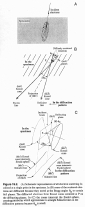 A line pattern representing the reciprocal image of the stereographic projection, that is produced from both elastic and inelastic scattering of the electron beam (Figure 11). The lines represent planes in the sample which have diffracted the election beam and intersect each other at particular crystallographic zones. When the incident electron beam strikes the sample, some elastic scattering occurs (diffraction) off of planes oriented to the Bragg angle of the incident beam. In addition, some inelastic scattering also occurs throughout the sample and in all directions (Figure 12). The inelastic scattered electrons may be oriented to the Bragg angle of other planes in the crystal and diffract off of them. The energy loss in the inelastic scattering is small in comparison to the incident electron energy. The diffracted beams, whether they are directly or indirectly scattered from the incident electron beam, produce diffracted cones off of the planes which are diffracting (Kossel cones) which intersects the Ewalds sphere producing the Kikuchi lines. The Kikuchi lines are actually curved, but due to the small wavelength of the electron beam the Bragg angles are small and the lines appear straight.