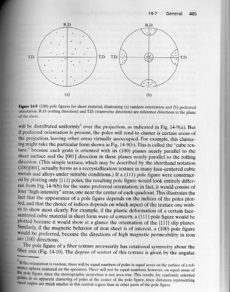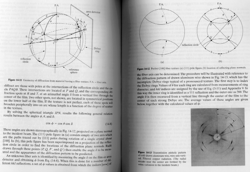 f = 54.7°, f is the angle of tilt of the (hkl) plane normal from the fiber axis and can be used to determine the predominant crystalline direction which corresponds with the fiber axis. This is termed a [100] fiber texture. For a fiber texture only one of the quadrants contains unique information so the pole figures are often drawn as 1/4 of a circle.The diffraction pattern from an oriented sample, when projected on a plane film or 2-d detector, displays arcs rather than Debye-Scherrer rings. This is shown in figure 14.13 p. 409. The angle from the fiber axis on the diffraction pattern to the center of the arc is