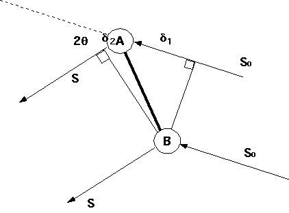 For 2 points A and B consider an incident unit vector wave of x-rays S0 and a exiting x-ray of unit vector S. The path difference for point A relative to B for S0 is d1 = S0 . AB. The path difference for point A relative to B for S is d2 = -S . AB. The total path difference is d = d1 + d2 = -AB . (S - S0). The phase difference is f = 2pd/l = -2p (S - S0)/l . AB. For diffraction the phase difference, f, is equal to n2p so, for diffraction, (S - S0)/l = 1/AB.