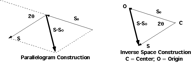 l can be obtained by a parallelogram construction as shown above. In construction of the inverse space vector the origin of the unit vectors S and S0 are shifted so they coincide. This point is called the center of the experiment and labeled C. The origin of inverse space is the point where the incident unit vector ends. This point is labeled O and is taken as P000. A construction showing the vector S-S0 is shown above.By swinging the vector S through the angle 2