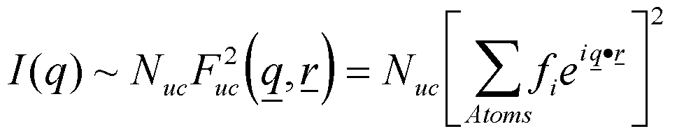 where q is related to the scattering angle, 2q (or sometimes q), by q = 4psin(q)/l, r is a real space vector that describes the position of an atom, f is the atomic form factor that describes the effective number of electrons associated with an atom including interference associated with electrons within an atom. The dot product of q and r yields a phase angle, fi. In XRD q is given by 2p times the reciprocal space location of the reflecting plane (h,k,l) and r is given by the real space location of the atom [u,v,w]. These definitions of the scattering vector and the real space vector yield the von Laue equations for diffraction (Bragg's law in 3-d space).