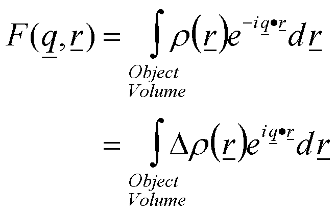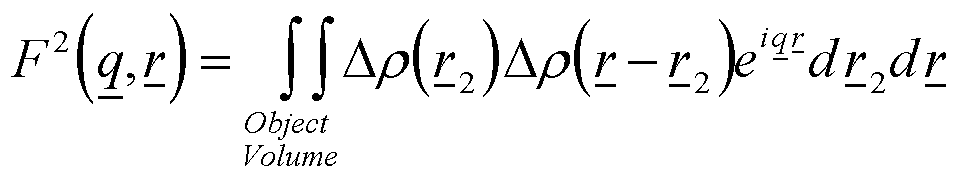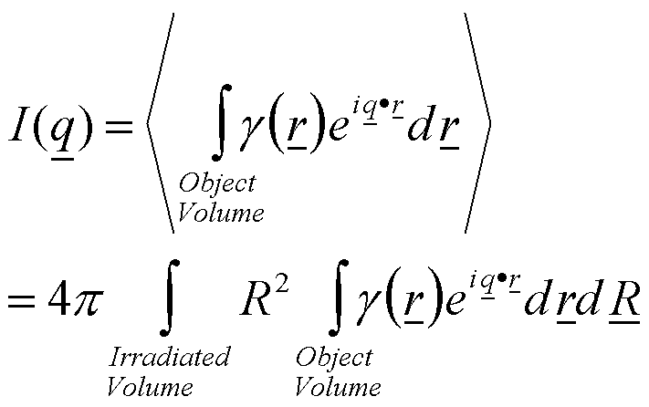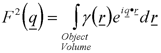 Equation (7) shows that the scattered intensity is proportional to the number density of objects in the scattering volume, N, and is proportional to the volume of the scattering elements, V. The integral term describes the interference effects associated with the distribution of electrons in an average object.
