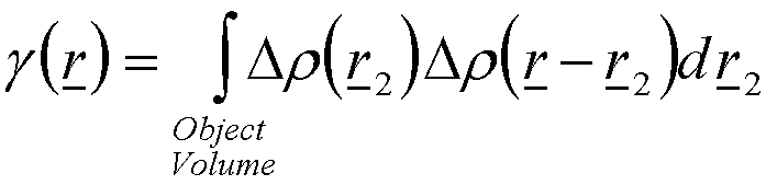The correlation function can be understood from a line throwing experiment. For lines of length r, g(r) is proportional to the probability that if one end of a line is in the object volume, that another randomly placed end of the line will also fall in the object. The correlation function is 0 for lines larger than the objects largest length and is Dr2 when r = 0. Between these limits the correlation function decays with a functionality that reflects the objects structure in a somewhat complex way. The correlation function is useful in describing objects of complex structure, for example, to compare different types of trees analytically one could calculate the correlation function and arrive at a number that was unique to evergreen trees. Such an analytic descriptor of trees is not possible in a normal non-integral approach to structure. The correlation function can yield average properties of the object through integrals and other manipulations such as the surface area, the average volume and mean object size. If rather than considering multiple origins for the line of length r in a fixed object, we consider a fixed line and move the object to all possible locations in 3-d space where the first end of the line lies in the particle and average the structure of the object in these positions we arrive a different understanding of the correlation function. For such a spatially averaged object differences in structure are blurred to a decay curve. The correlation function represents the square of electron density for such an averaged object. Equation (3) using eq. (4) becomes,
