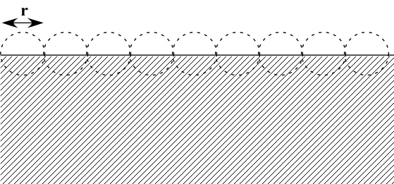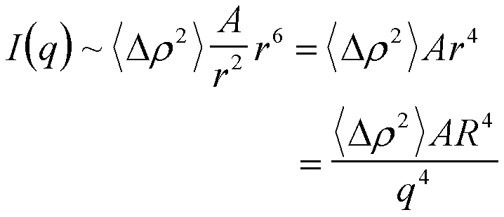 When two phases meet at a smooth sharp interface with phases of infinite extent the constant contrast factor within each of the two phases is constant leading to total destructive interference between waves from different parts of the phase. For phases that are much larger than the size of observation, r = R/q, the source of scattering is the interface. The interface can be decomposed into a series of spheres of size r as shown in Fig. 1. N(r) = A/r2 where A is the surface area of