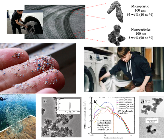 Microplastics are the results of mechanical and chemical degradation of plastics either in the natural enviroment, such as fishing line residue in the ocean, or in anthropogenic processes, such as tire wear particles, and dryer lint. Some microplastics are intentionally included in cosmetics. Microplastics are particles between 1 and 1,000 micron and nanoplastics are smaller than 1 micron. In terms of mass, microplastics are a greater fraction, in terms of number, nanoplastics may be a much larger fraction of particulate plastics in the environment. These two classes of particulate pollution may pose siginificantly different impacts.