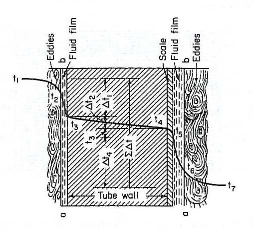 The system just described is extremely complicated and difficult to model without extensive fluid mechanics calculations. In addition, it is unpractical to expect to measure the thicknesses and temperatures of the various layers in the flowing fluid, so a simplified technique will be presented that calculates the local rate of heat transfer between the fluids, which is given by: