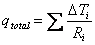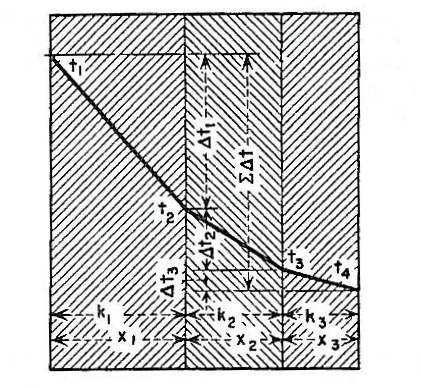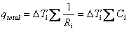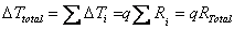 As stated earlier, the heat transfer (q) is uniform, so the total temperature drop from one edge of the system to the other is equivalent to the summation of the temperature drops of each sub-segment within the system, resulting in: