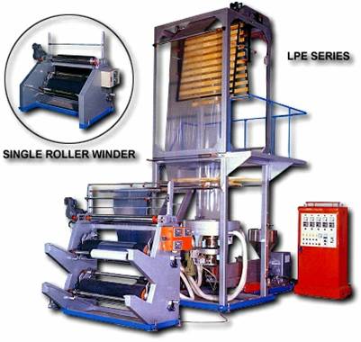 Blown film is a commercial process used to produce a number of products, including grocery bags, garbage bags, and food packaging. The following is an image of a typical blown film line: