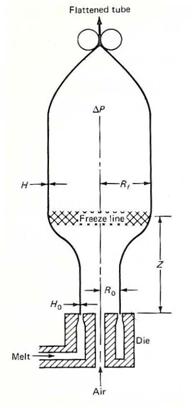 Figure 1 depicts the entire blown film tube, from die to take off nip. Noted are the initial film thickness (H0) =of the melt as it exits the die (or die opening), the pre-blown tube radius (R0), the frost line height (Z), the film thickness after blow up (H), the tube radius after blow up (Rf), and the pressure differential between the inside of the bubble and the ambient surroundings (DP).