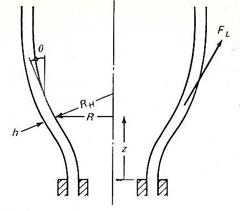 Figure 2 focuses on the dynamic zone of the blown film process, where the film begins to be blown in the transverse direction. Noted in the figure are the film thickness (h), the principal radius of curvature (RH), the radius to the inner wall of the film (R), the force in the longitudinal direction (FL), and the angle between the circumferential direction and the direction of flow (q), where the direction of flow is indicated by z.