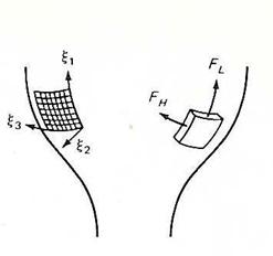 Figure 3 shows the dynamic coordinate system (noted by x1, x2, and x3) and the force in the longitudinal (FL) and circumferential (FH) directions. The noted cartesian system is embedded in an element of fluid in the inner surface of the film and moves with the film throughout the film blowing process.